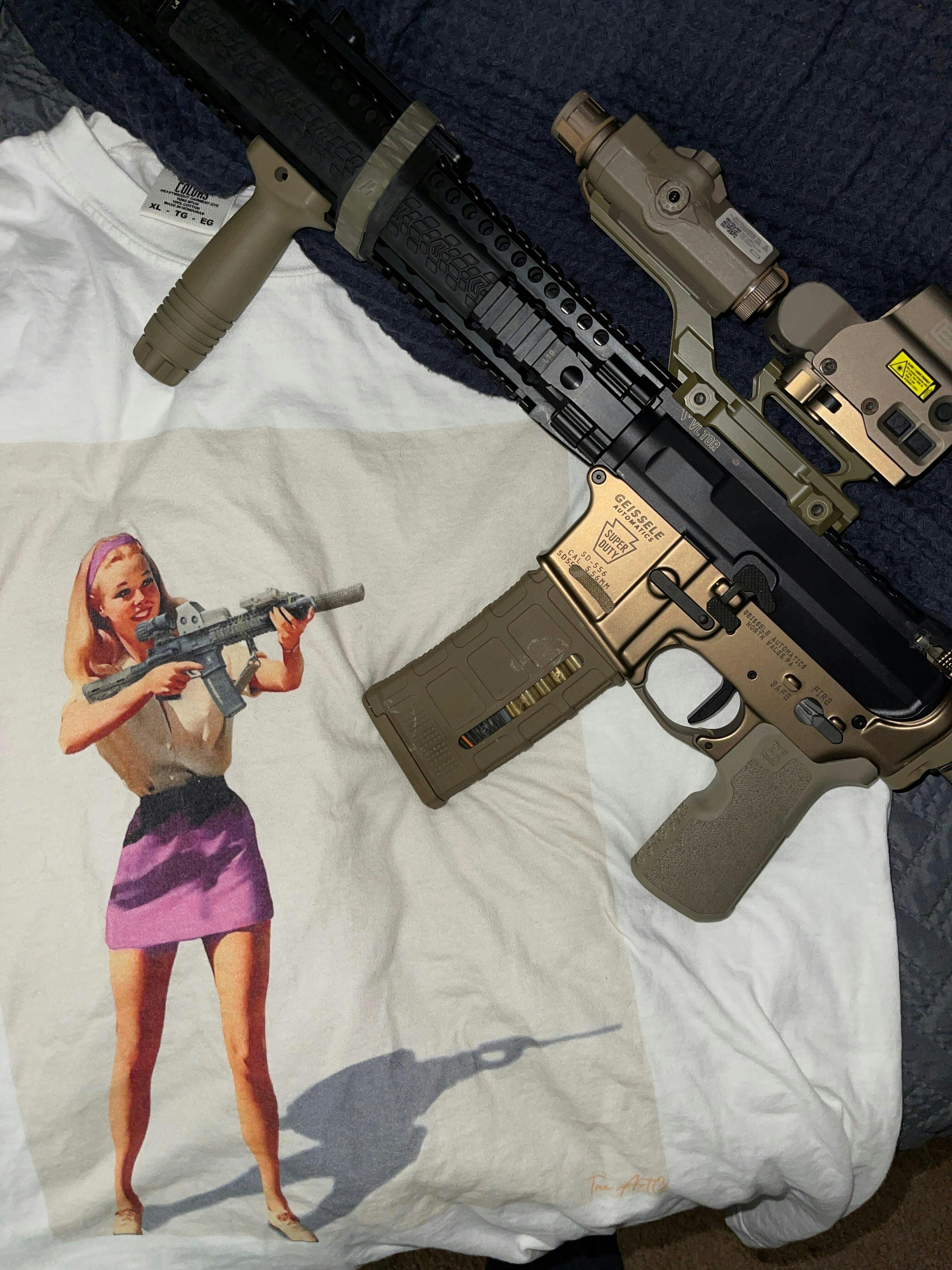 This vintage pin-up girl T-shirt features a playful yet tactical design, blending mid-century charm with contemporary military elements. The bold fusion of femininity and strength makes it a unique piece that appeals to those who appreciate retro aesthetics with a modern twist. Perfect for fans of pin-up style art, military enthusiasts, and those looking for a statement piece to add to their casual wardrobe.