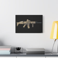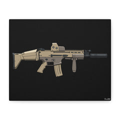 This canvas features a digitally illustrated FN SCAR-L (SCAR 16) Short Barrel Rifle, chambered in 5.56 NATO and kitted out with a suppressor, EOTech optic, vertical foregrip, and the unmistakable βUGG bootβ stock that somehow became iconic.
