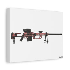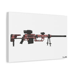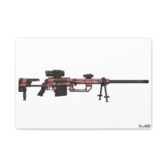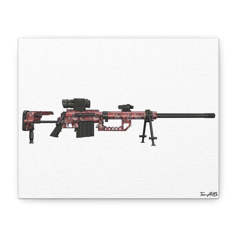 This white canvas features a detailed digital illustration of the M200 Intervention finished in the unmistakable red digital camouflage made legendary in early modern warfare gaming culture. With its extended barrel, massive profile, and thermal optic setup, the Intervention became one of the most iconic sniper rifles of its era.